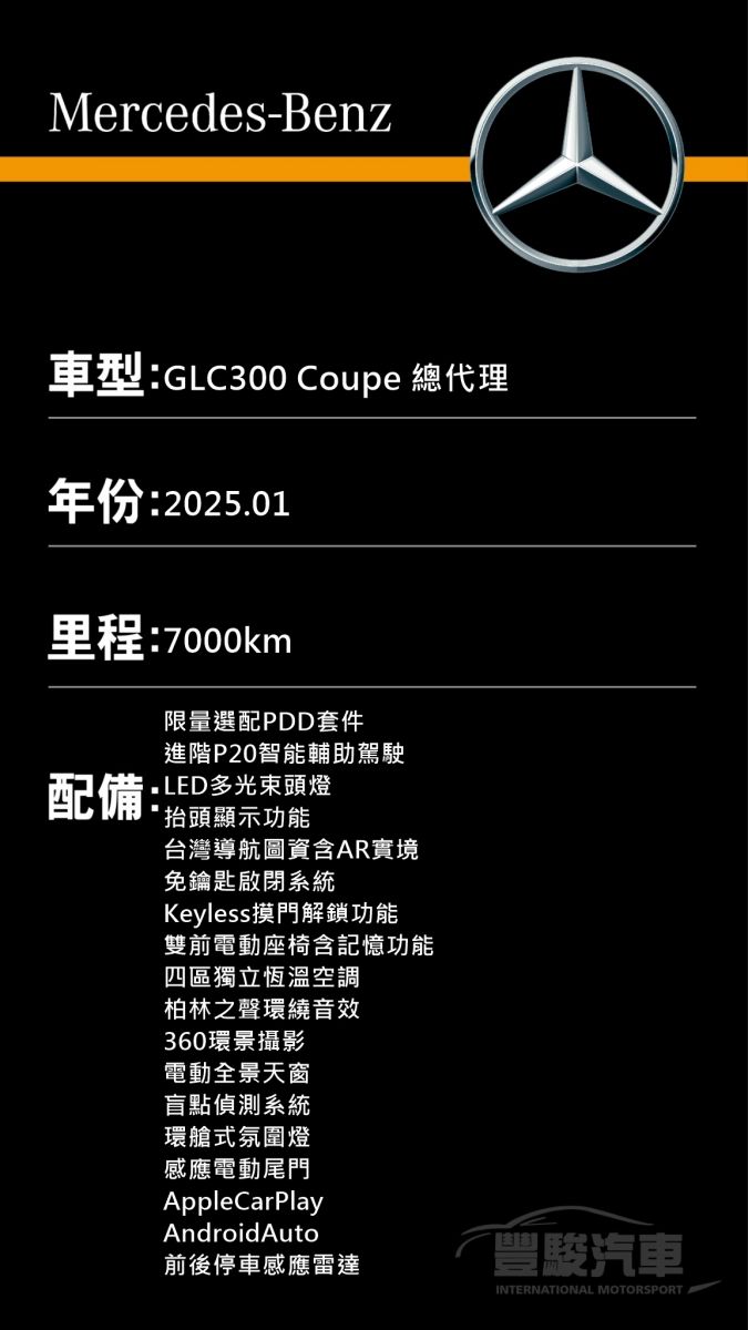 首頁>線上賞車>2025總代理GLC300 頂級PDD套件 四區恆溫 AR實境導航